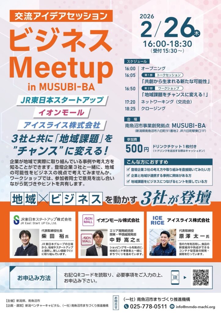 ●会場:南魚沼市事業創発拠点MUSUBI-BA(南魚沼市六日町91-2 JR六日町駅東口1F)